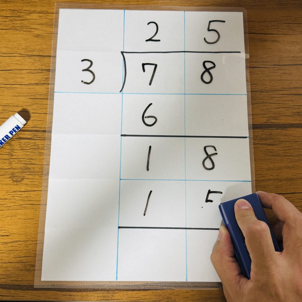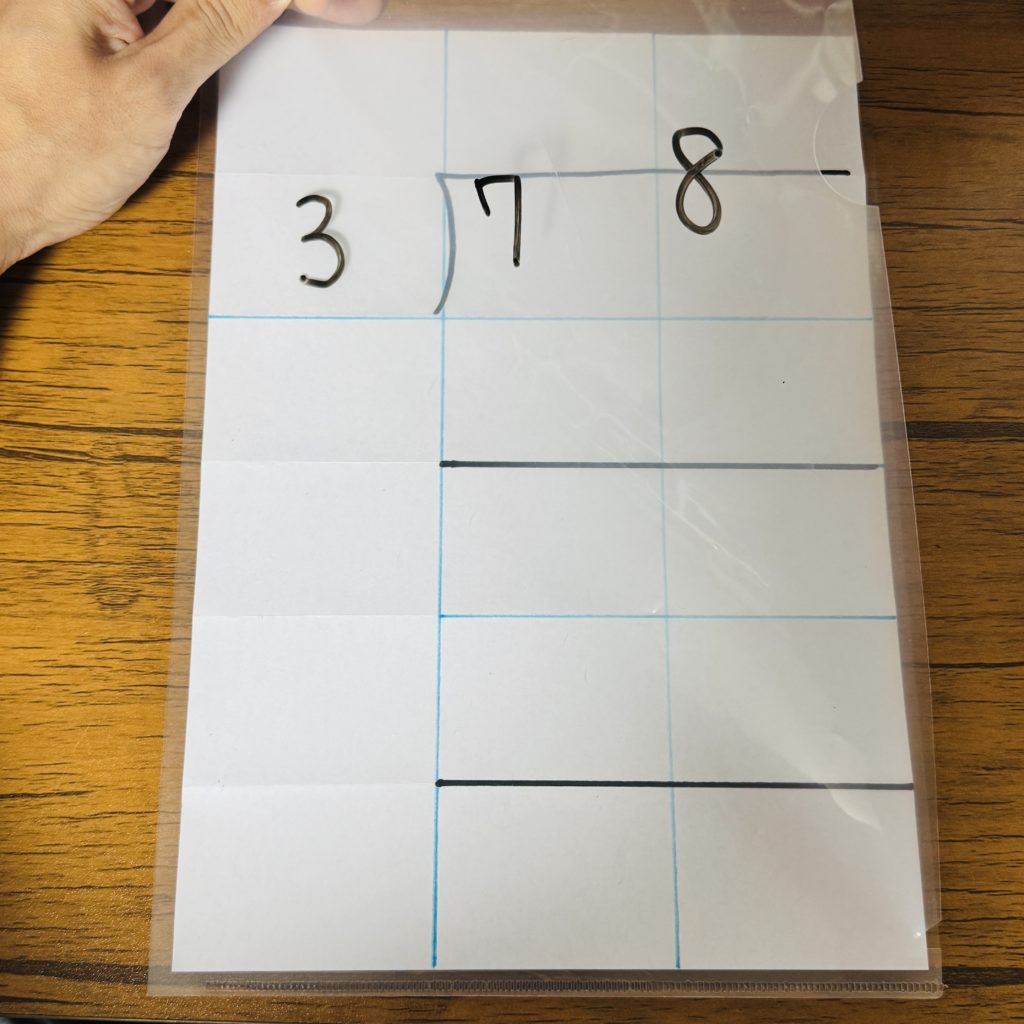 ノートを大きなマスのものに変更したり、A4用紙に水色マジックで罫線を書いてからクリアファイルに入れて「わり算ボード」を作ったりするなど、本人が学習しやすい道具を整えます。
