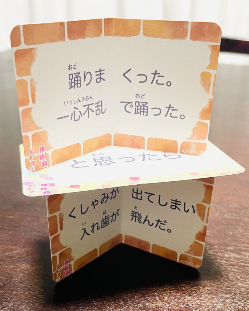 おもしろ短文と接続カードを組み合わせるゲームで楽しく作文に慣れ親しむことができますよ!
