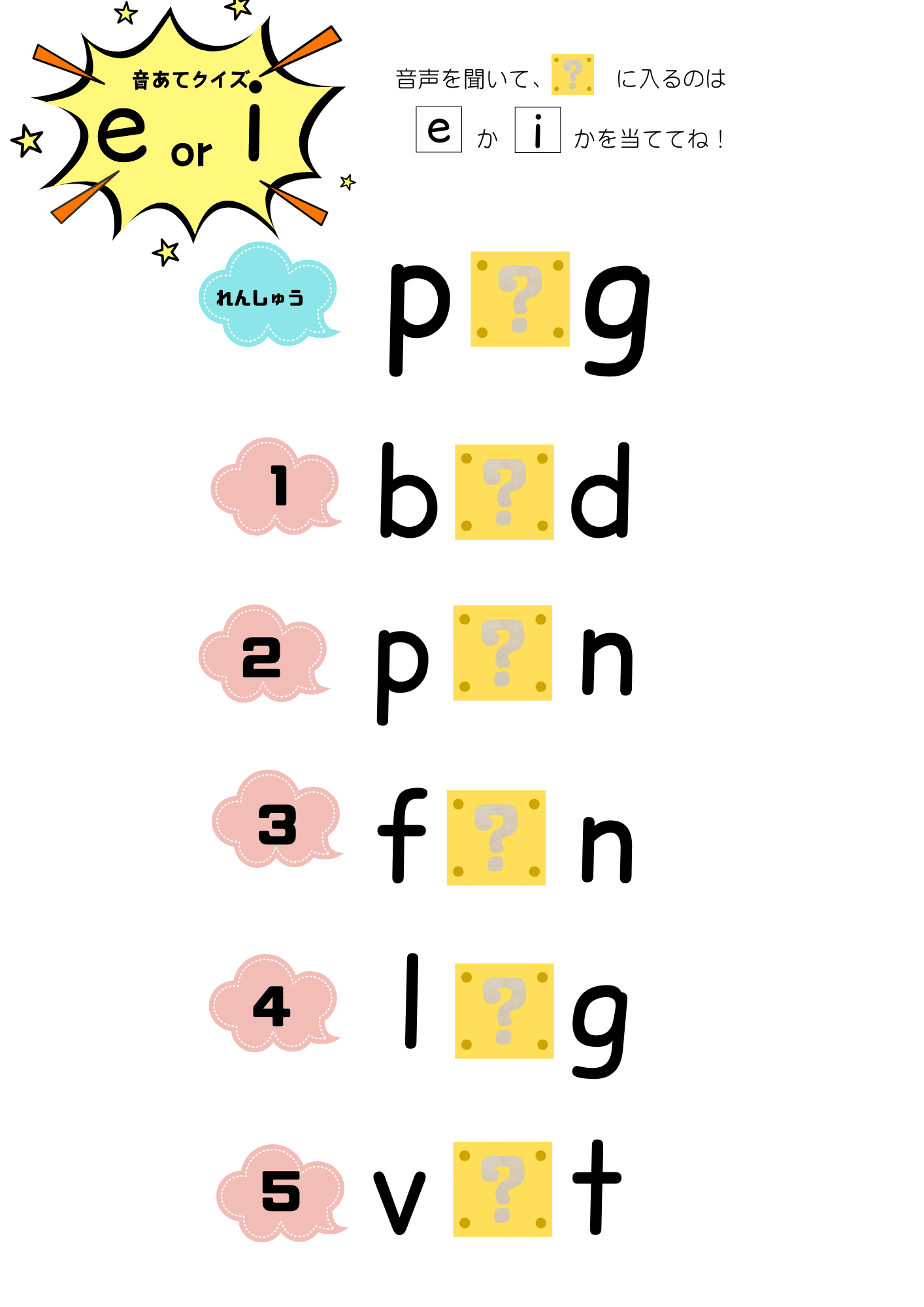 英語が苦手なお子さんは、音を出すのにも最初抵抗があるかもしれません。そんな場合、「まずは聞く」でOKです。音を当てるにあたって、正解するか不安感が強い場合は最初は動画を観ながら答え合わせの段階でeかiの文字を選ぶといった形でも構いません。とにかく不安感のない挑戦をすることが大切なので、お子さんに合わせてルールを変えてみてください。単語に挑戦する前に、音だけを聞いてeかiを当てることだけに注力しても良いでしょう。本教材の最後に音声ファイルを添付していますので、こちらもぜひご活用ください。