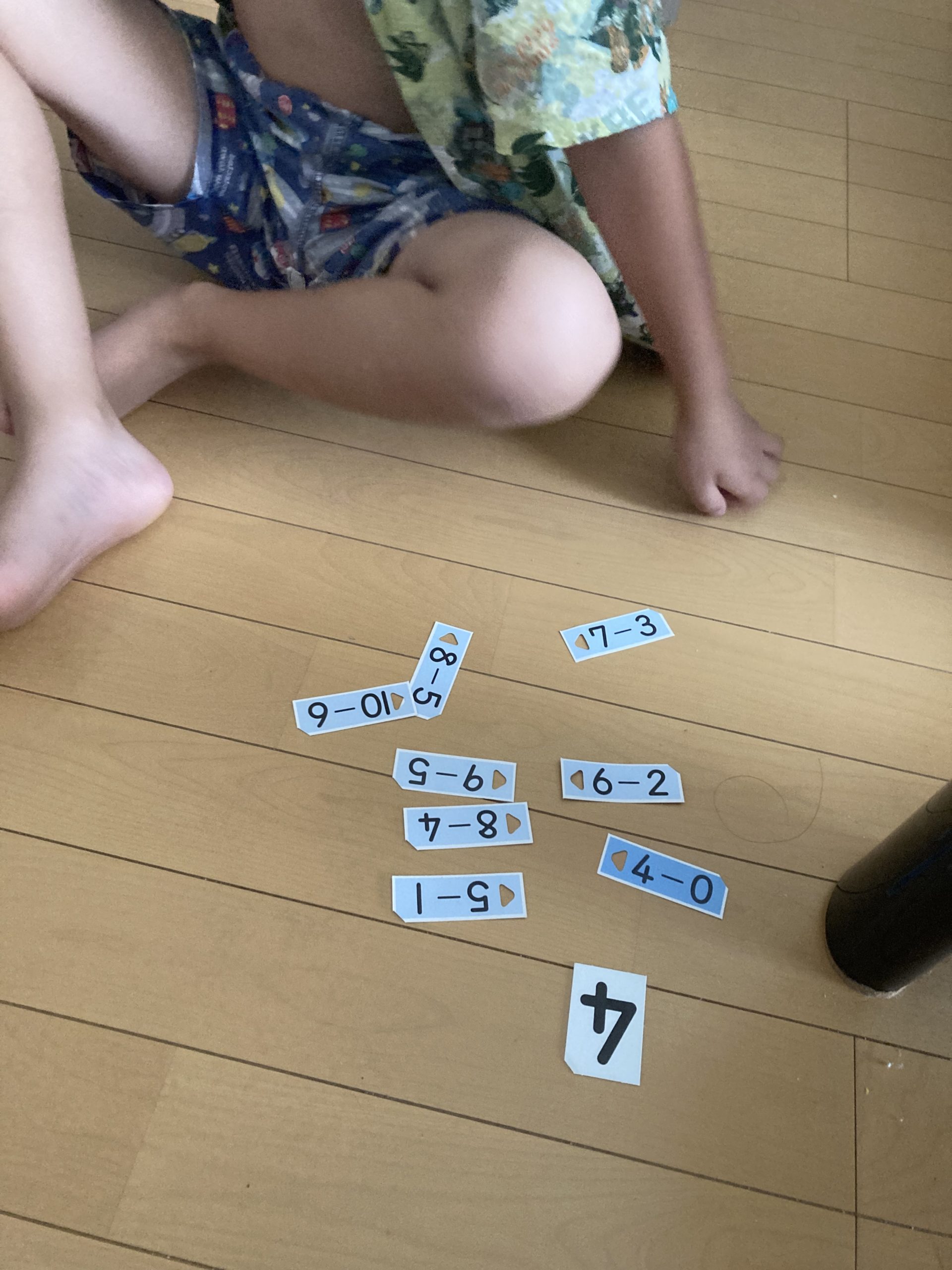 花炎参加者繰り下がりのない引き算なら苦労なくできてるのですか?うちの7歳は繰り下がりなしのもあやしかったので、夏休みにさんすうボックスの数カードでこんなのやってました↓