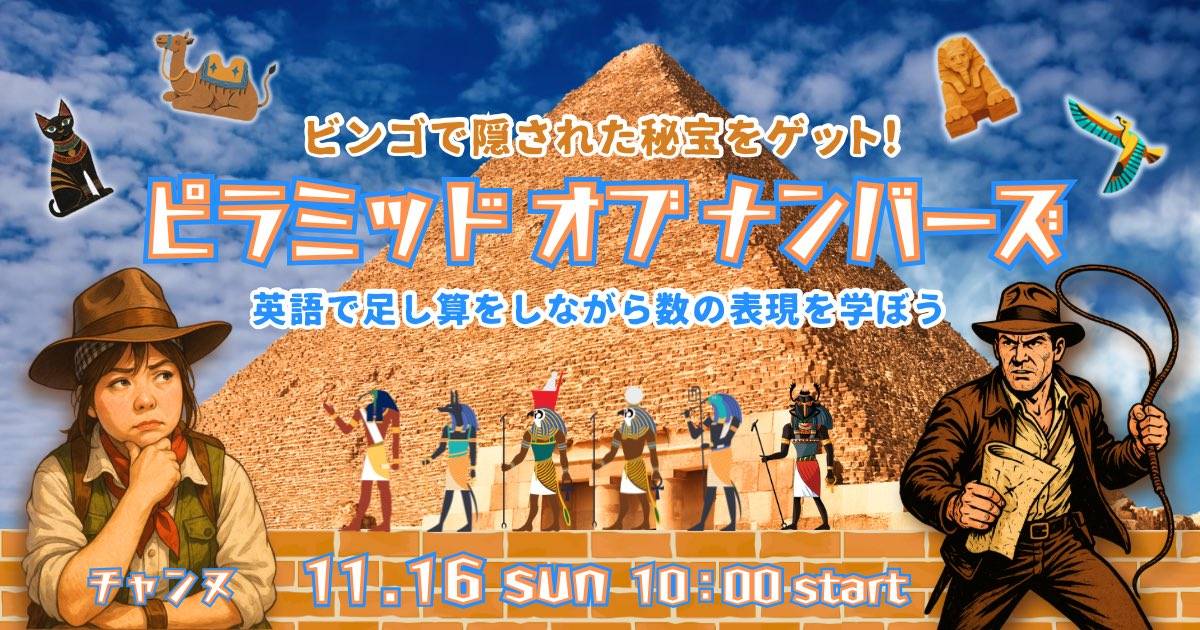 今回はエジプトを舞台に、暗号シートを読み解きながら足し算をすることで、2桁の数字を学びます。暗号から割り出した数字でビンゴを揃え、ピラミッドに隠された秘宝をゲットする協力型ゲームです!