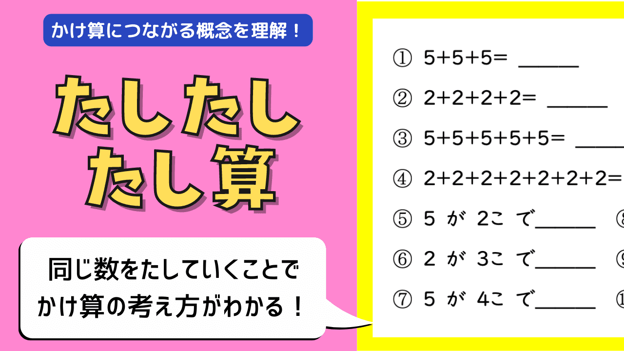 🔑【小1・小2】たしたしたし算|たし算を計算しながらかけ算の仕組みが学べる算数教材 会員限定 2023/6/9 会員限定小1教材小2教材算数教材限定教材 かけ算たし算小1小2算数計算 かけ算の学習を始める前に、かけ算の土台となる「同じ数ずつ増やす」っていう感覚を育てましょう! 1年生で習った「3つの数の計算」を更にレベルアップしてかけ算の土台を育てます! こんな子にオススメ ✅ これからかけ算の学習に入る ✅ かけ算を暗記するのが苦手 ✅ 楽しく計算してかけ算の答えを出したい す。子どもに合わせて遊び方を工夫してみてください。 ここから先は会員限定です。 ログイン または 会員登録 をしてください
